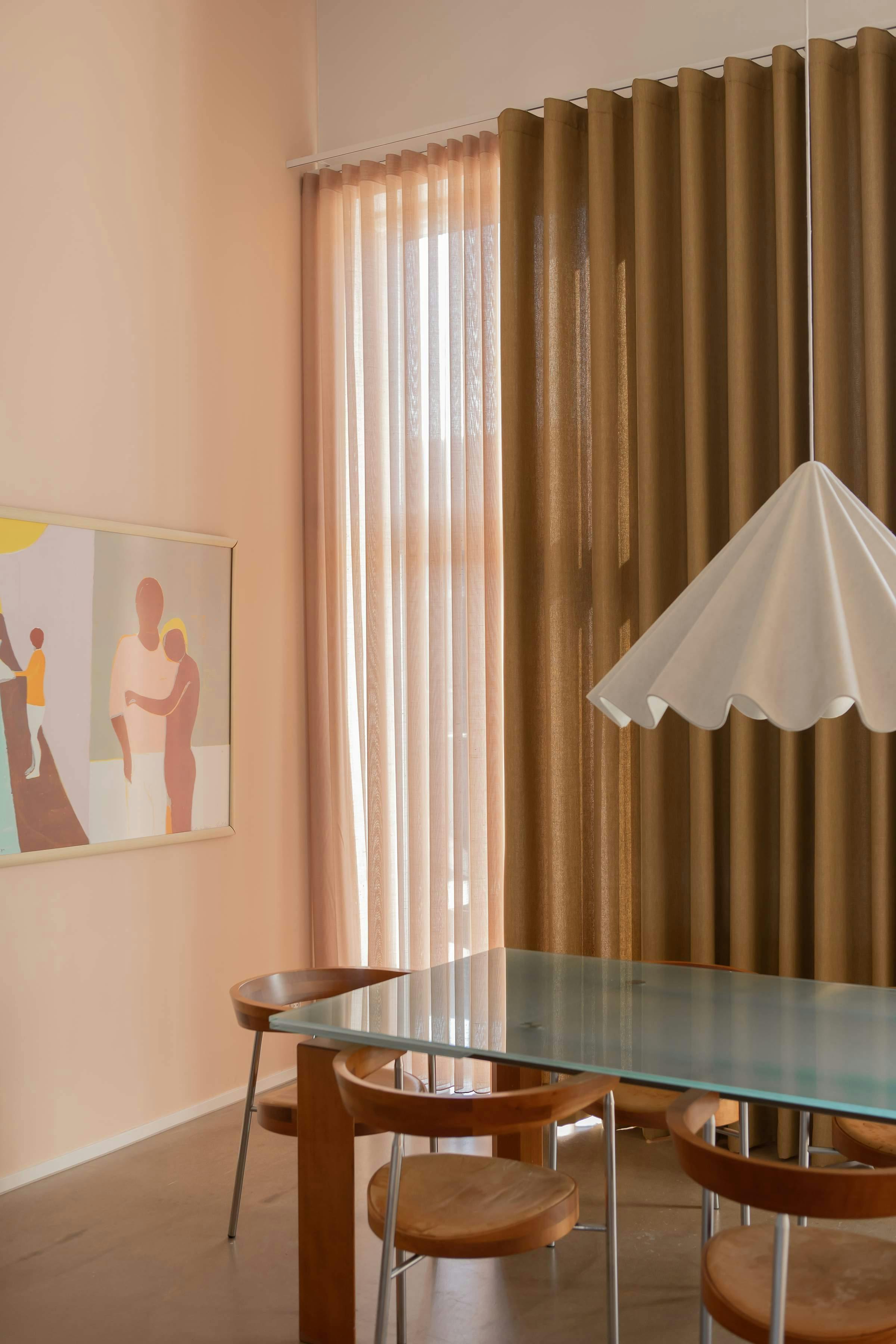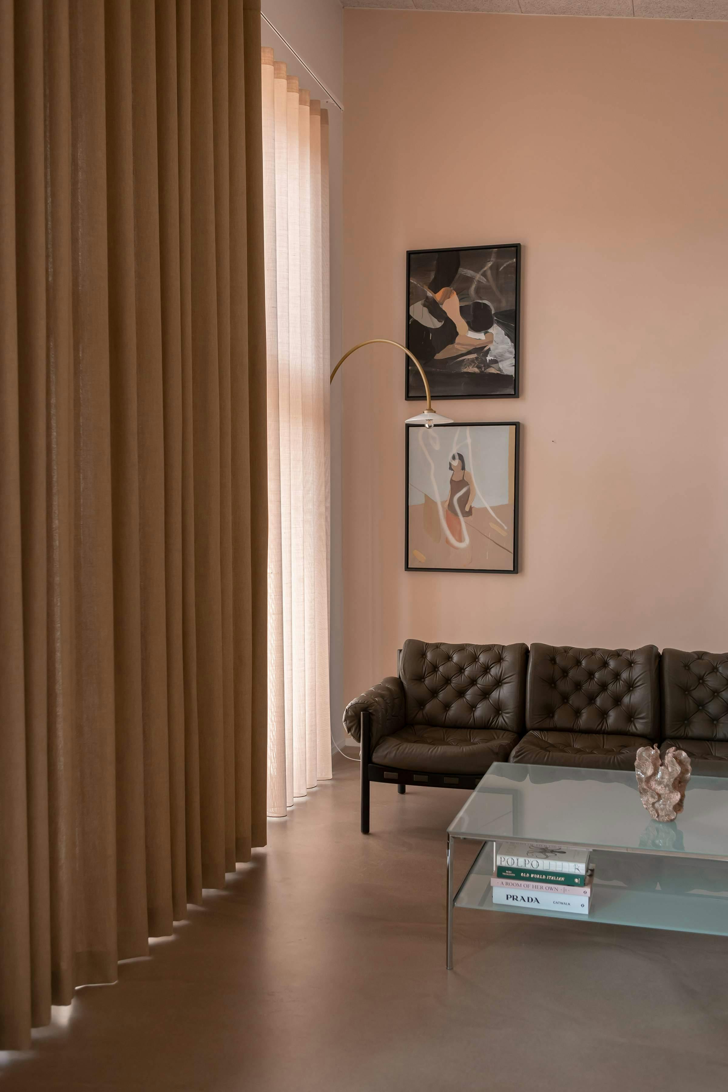 Gardinerne indgår som nærmest installationskunst i Lisbeths kreative og farverige indretning. De tilføjer desuden en æstetisk blødhed til de enorme vinduespartier og den imponerende loftshøjde på hele 4 meter i den åbne stue og spisestue.