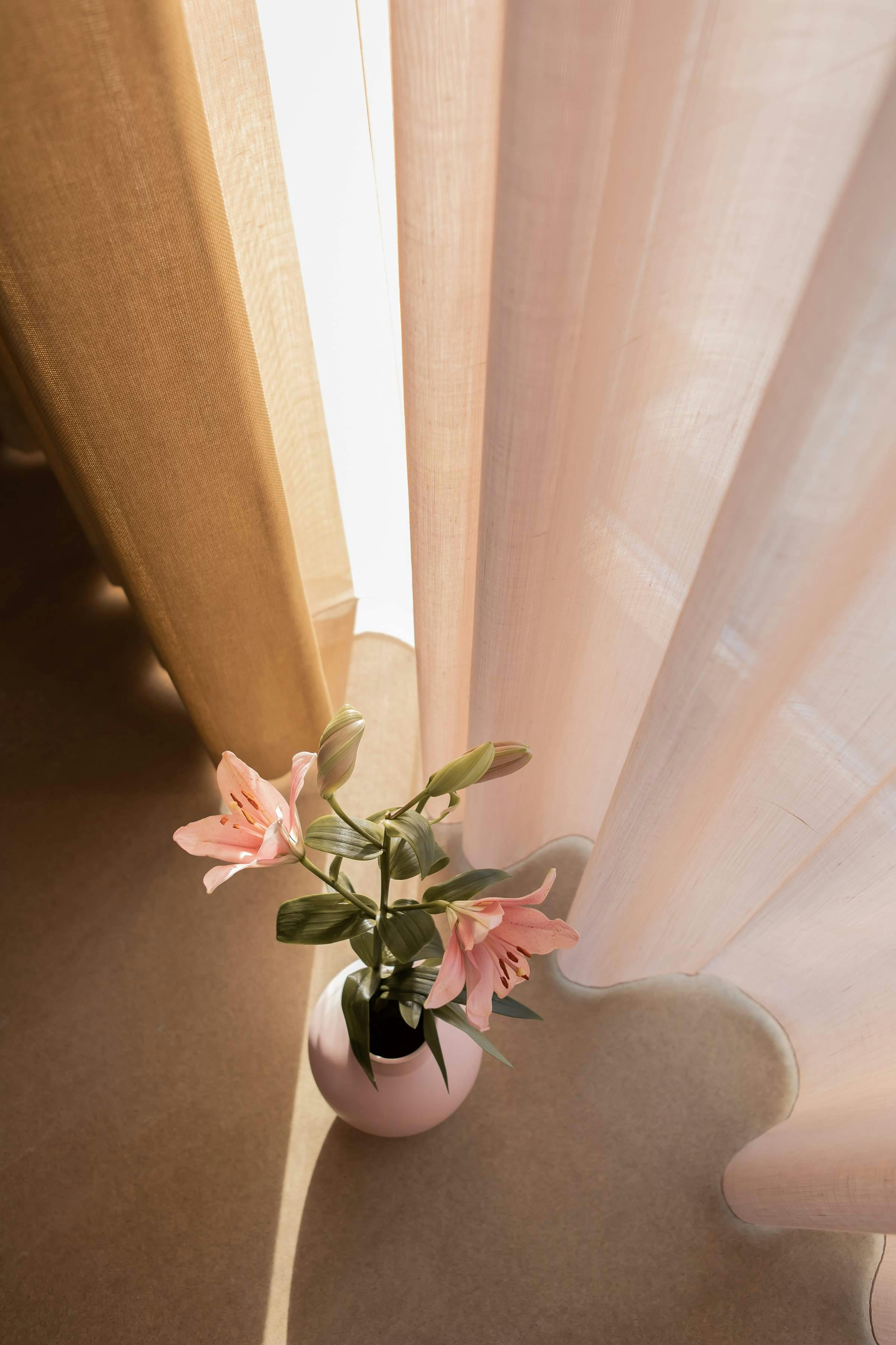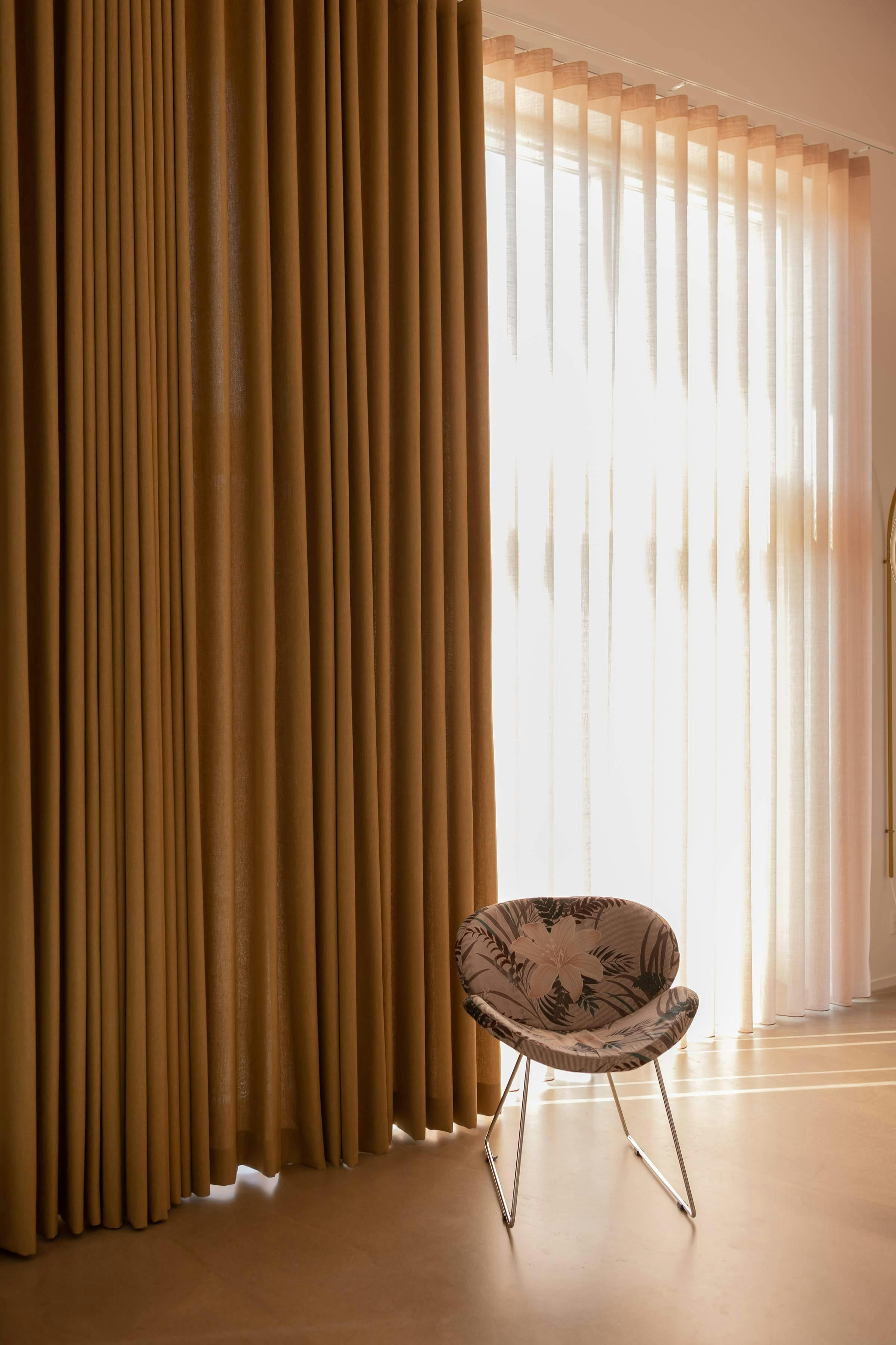 Lisbeths dristige farvevalg bestående af et rosa florlet stofgardin af typen ”Wisper” sat sammen med vævet ”Polo”, et tungt og tæt korngult stofgardin giver unikke farvespil som skifter med solens placering i løbet af dagen.
